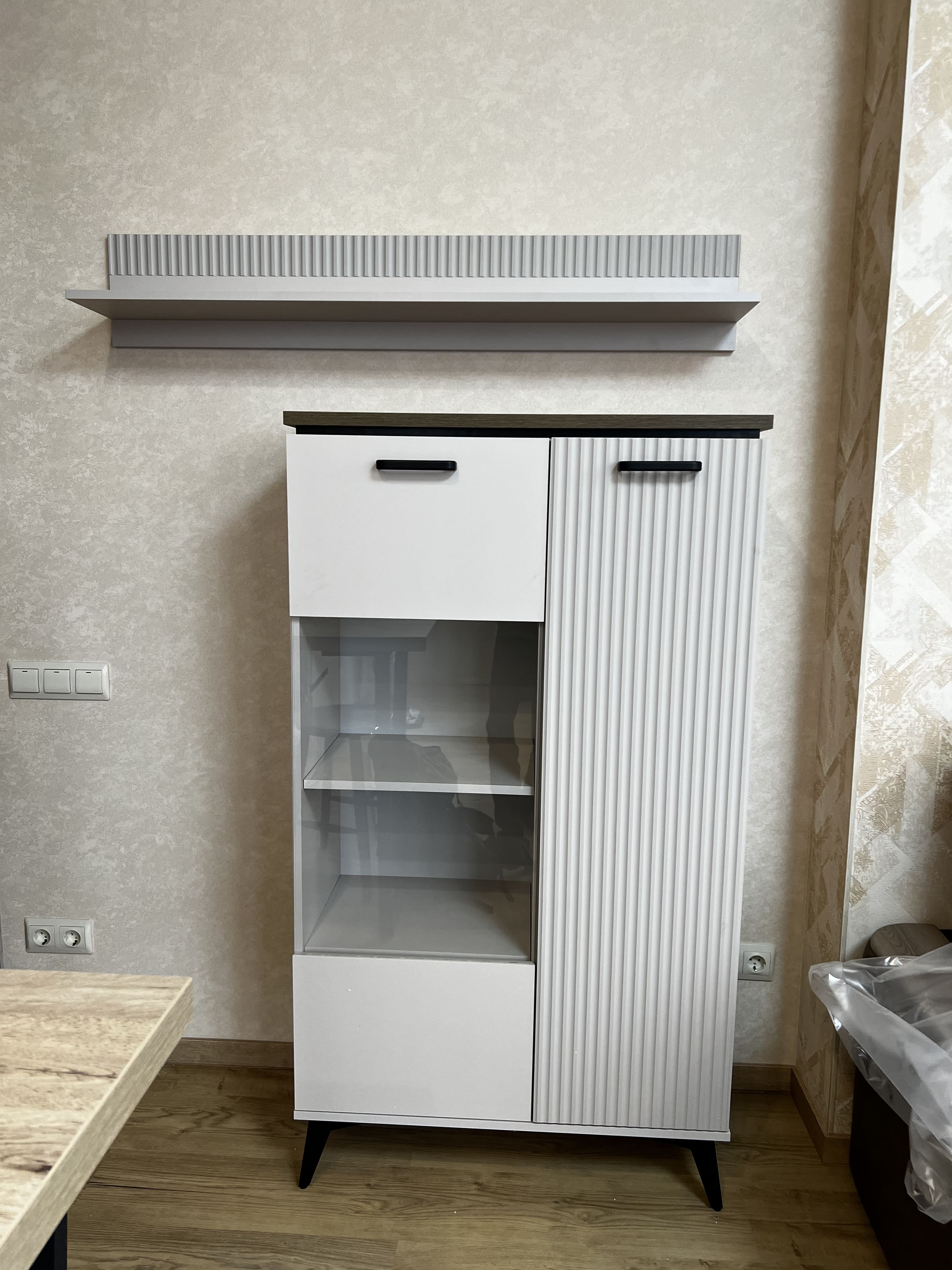 Открытая навесная полка Vinati — лаконичное и стильное дополнение к интерьеру. Светло-серый фасад с рифлёной вставкой придаёт полке выразительность, не перегружая пространство.