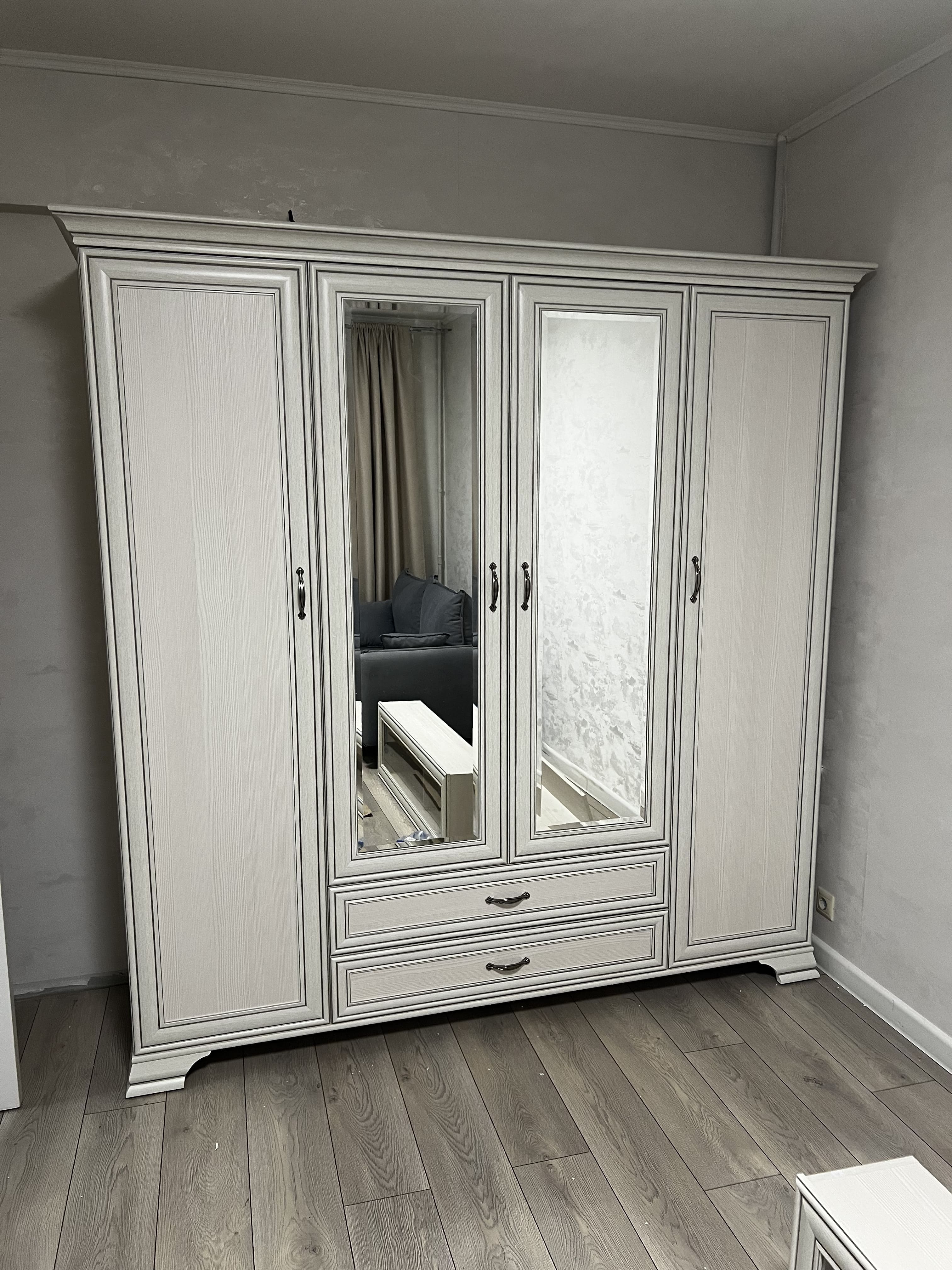 Шкаф состоит из четырёх створок, одна из которых дополнена зеркалом во весь рост — это удобно для примерки и создания образов. Внутри шкафа предусмотрены полки, штанга для вешалок и два выдвижных ящика на шариковых направляющих. Такое распределение внутренних зон позволяет разместить как повседневную, так и сезонную одежду, обувь и аксессуары.