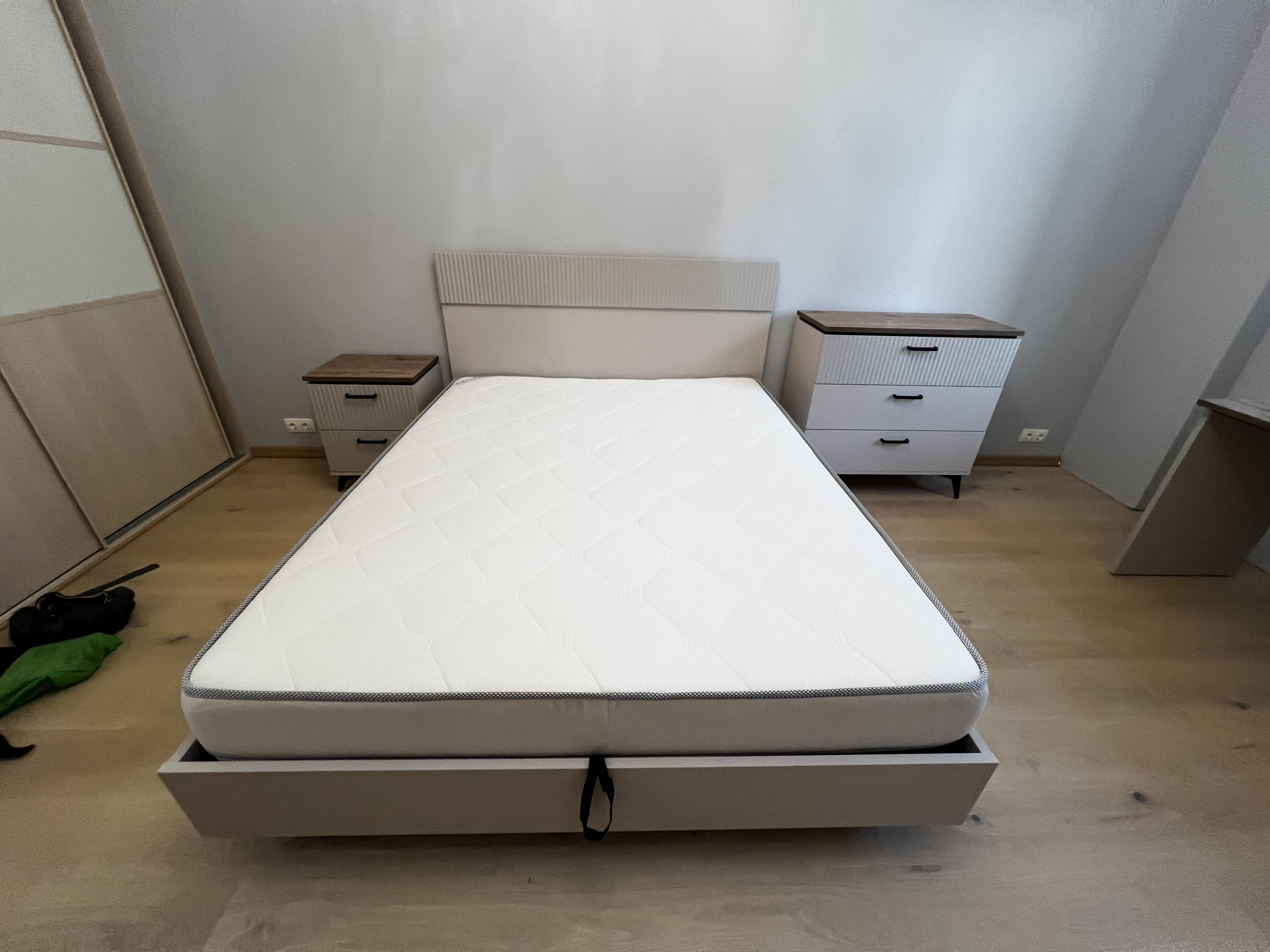 Благодаря шариковым направляющим ящики открываются плавно и бесшумно — идеально для спальни. Каждый из двух ящиков выдерживает до 5 кг, а столешница — до 10 кг нагрузки.