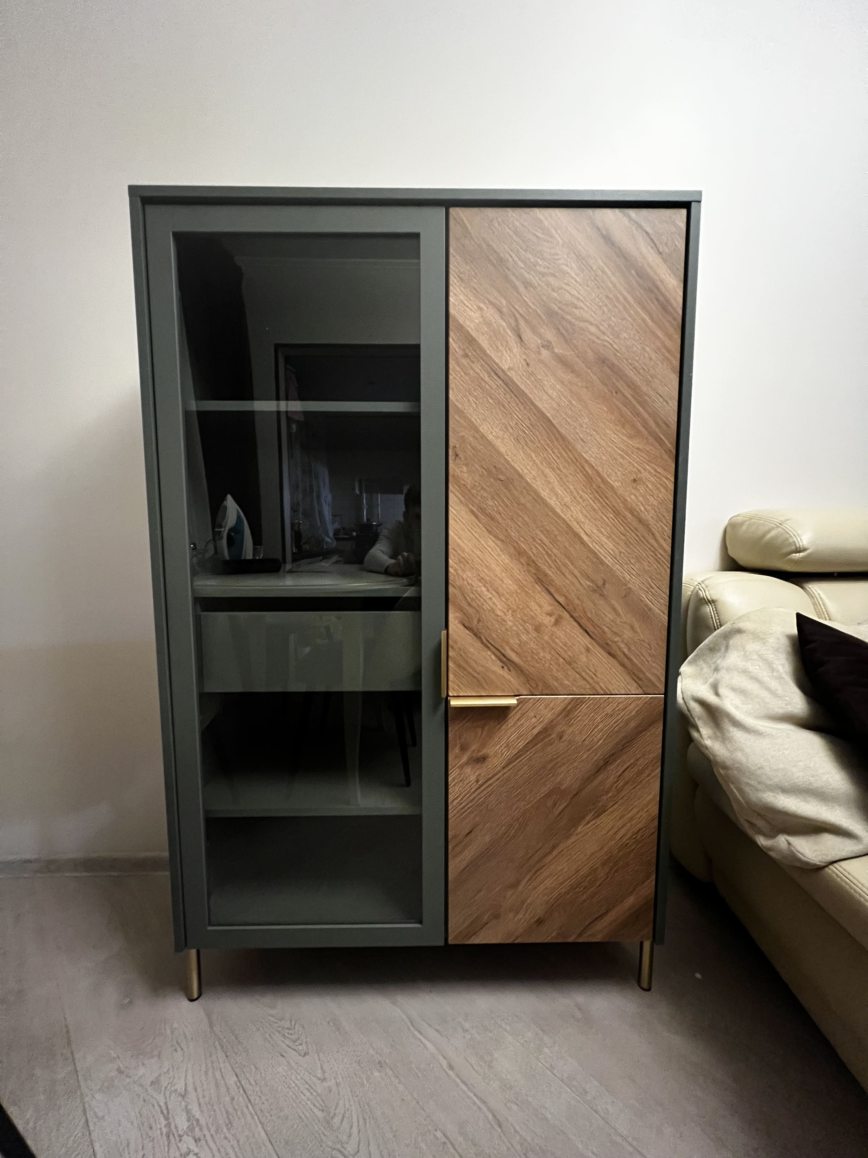 Витрина Siena дымчатый зеленый/дуб вотан REG1W1D/140 — то стильное и практичное решение, идеально подходящее для гостиной или столовой.