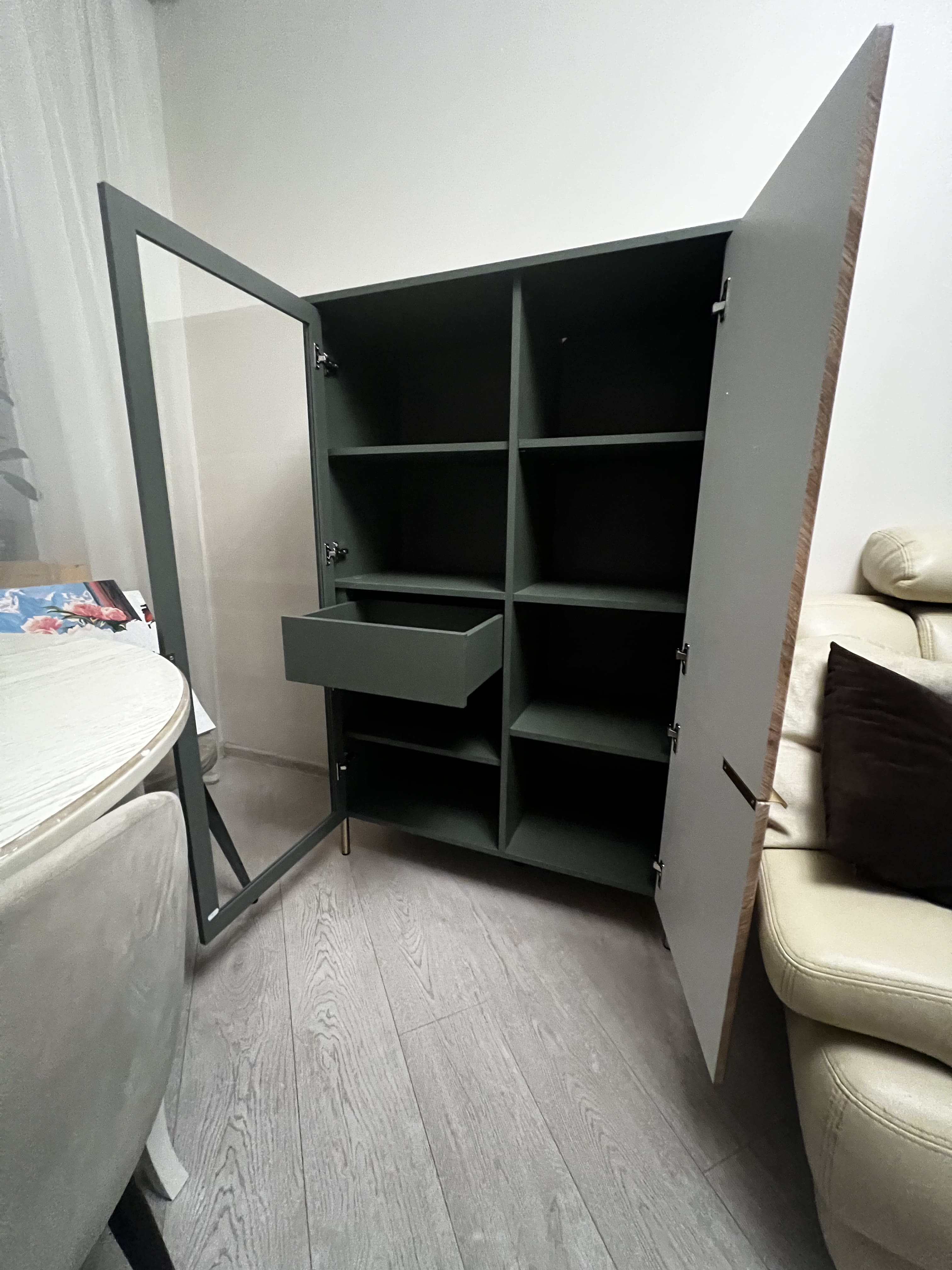 Левая часть витрины оснащена стеклянной дверцей с полками, идеально подходящими для размещения декоративных элементов, посуды или книг. Ниже расположены открытые полки и выдвижной ящик на направляющих скрытого крепления. Справа за глухой дверцей в цвете дуб вотан имеются дополнительные полки для комфортного хранения необходимых предметов.