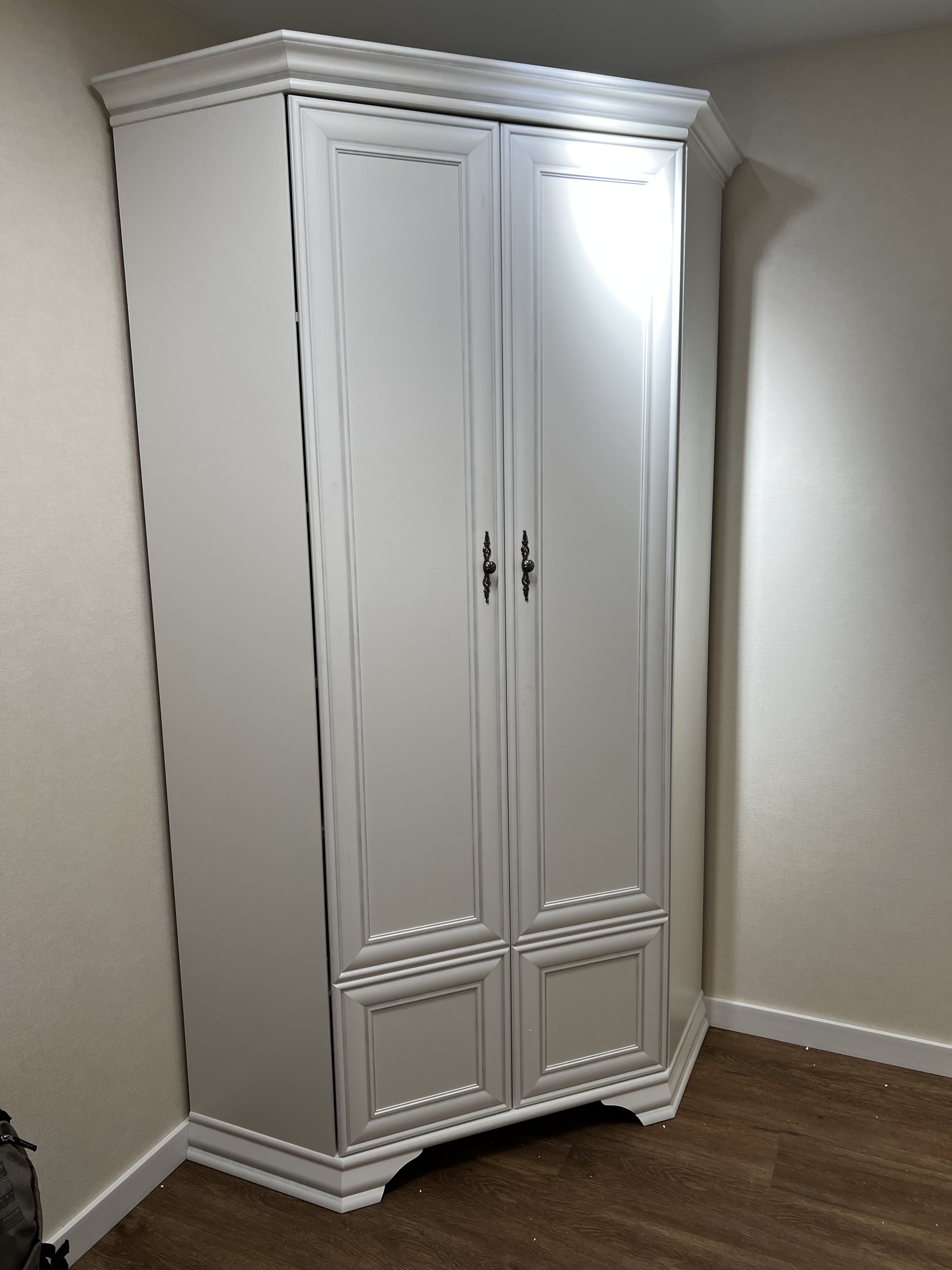 Она настолько универсальна, что без проблем впишется в любой современный дизайн. Стиль набора модульной мебели подчеркивается лакированной патинированной планкой в фасадах, карнизами — завершающим акцентом в зеркалах и высоких элементах набора, витиеватыми ручками.