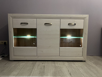Великолепные фасады изделий Мальта удачно контрастируют со вставками цвета Орех лион, металлические ручки добавляют изящества, а подсветка стеклянных полок выгодно подчеркивает древесную текстуру.